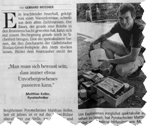 Jeden Juli finden in Giebelstadt die Florian-Geyer-Festspiele statt, in denen es um einen Bauernaufstand im 16. Jahrhundert geht. Da wird viel geschossen und in Brand gesteckt und so hat der Feuerwerker Matthias Keller allerhand zu tun. Die Krux: Schauspieler und Publikum sind immer nah an der Gefahrenzone!