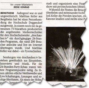 Aufregend war es und ungewöhnlich: Matthias Keller aus Bergtheim hat bei einer Fernsehsendung der Hochschule Deggendorf mitgewirkt. In einem noch nie da gewesenen TV-Marathon produzierten die angehenden Medientechniker für den Hochschulsender „doschauher.tv“ ein durchgängiges 24-Stunden-Programm, das rund 200 Besucher anlockte und live im Internet übertragen wurde. Und Matthias Keller war dabei – als Pyrotechniker…