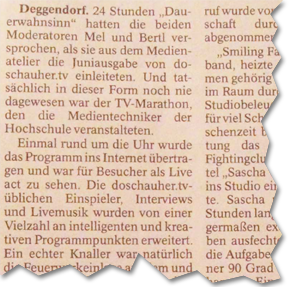 Deggendorf, 24 Stunden „Dauerwahnsinn“ hatten die beiden Moderatoren Meld und Bertl versprochen, als sie aus dem Medienatelier die Juniausgabe von doschauher.tv einleiteten. Und tatsächlich in dieser Form noch nie dagewesen war der TV-Marathon, den die Medientechniker der Hochschule veranstalteten.
